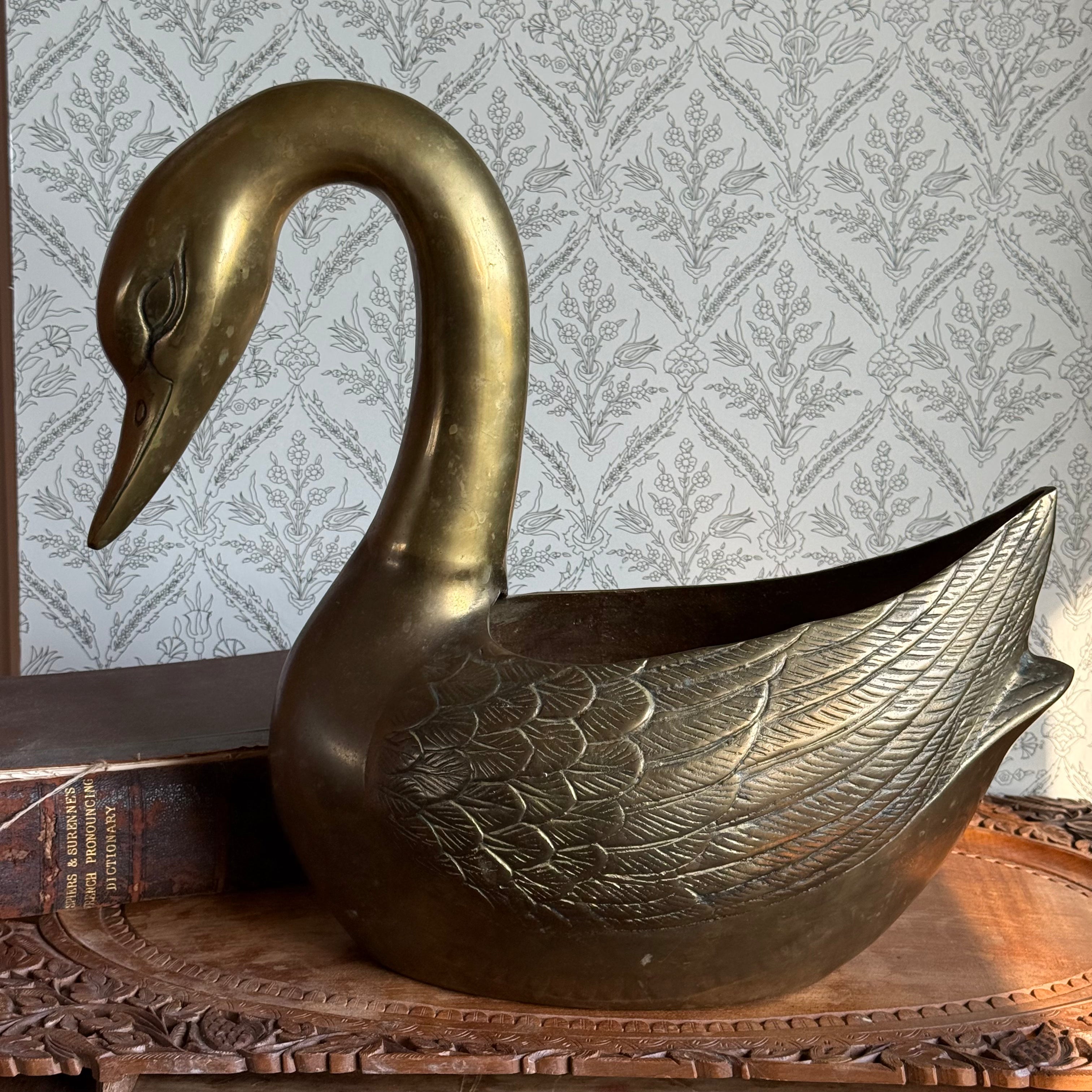 Mid-20th Century Large Brass Swan Planter with Detailed Feathering